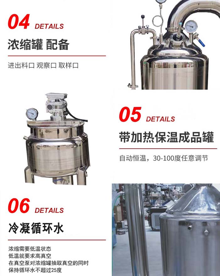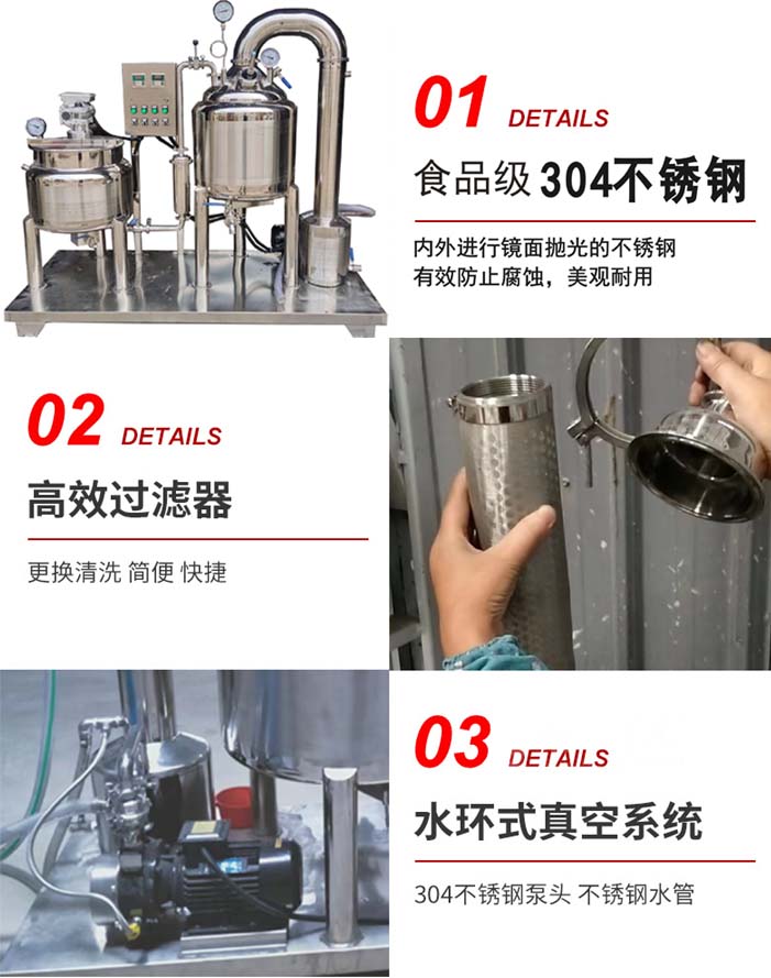 1 .設(shè)備由預(yù)熱罐、過濾器、濃縮罐、冷凝器、回收罐、真空泵部件組成,結(jié)構(gòu)緊湊,占地面積小。